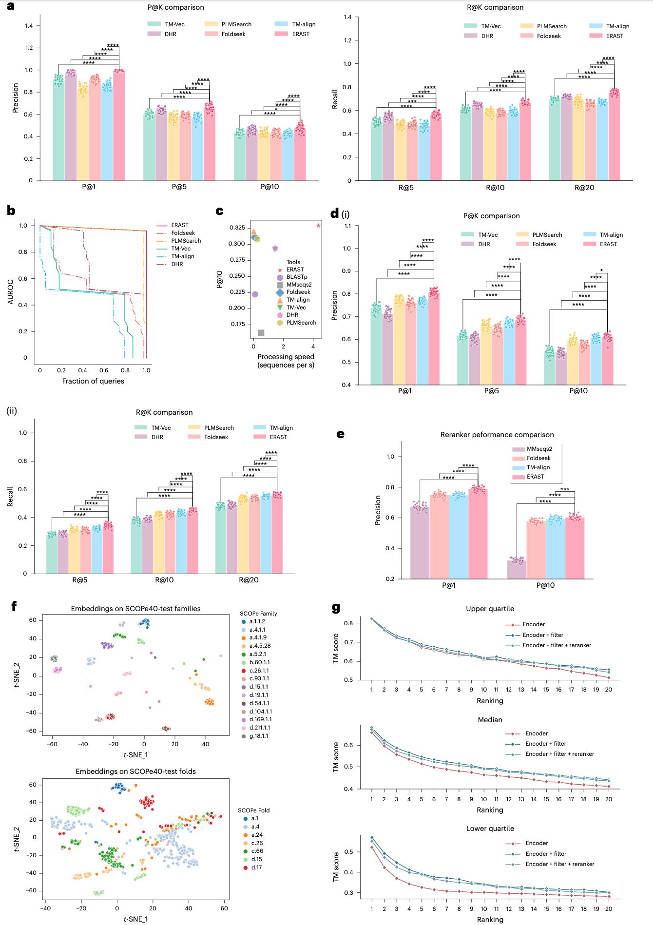 作者首先在SCOPe40-test数据集上比较了不同方法的“全部-对-全部”搜索总时间。如图2c所示,无重排序器版本的ERAST利用其优化的基于向量的搜索,在速度和精度上均超越了现有的同源性搜索方法。与基于结构的方法相比,ERAST的搜索速度比Foldseek快50倍,比TM-align快50,000倍,同时提供更好的精度。