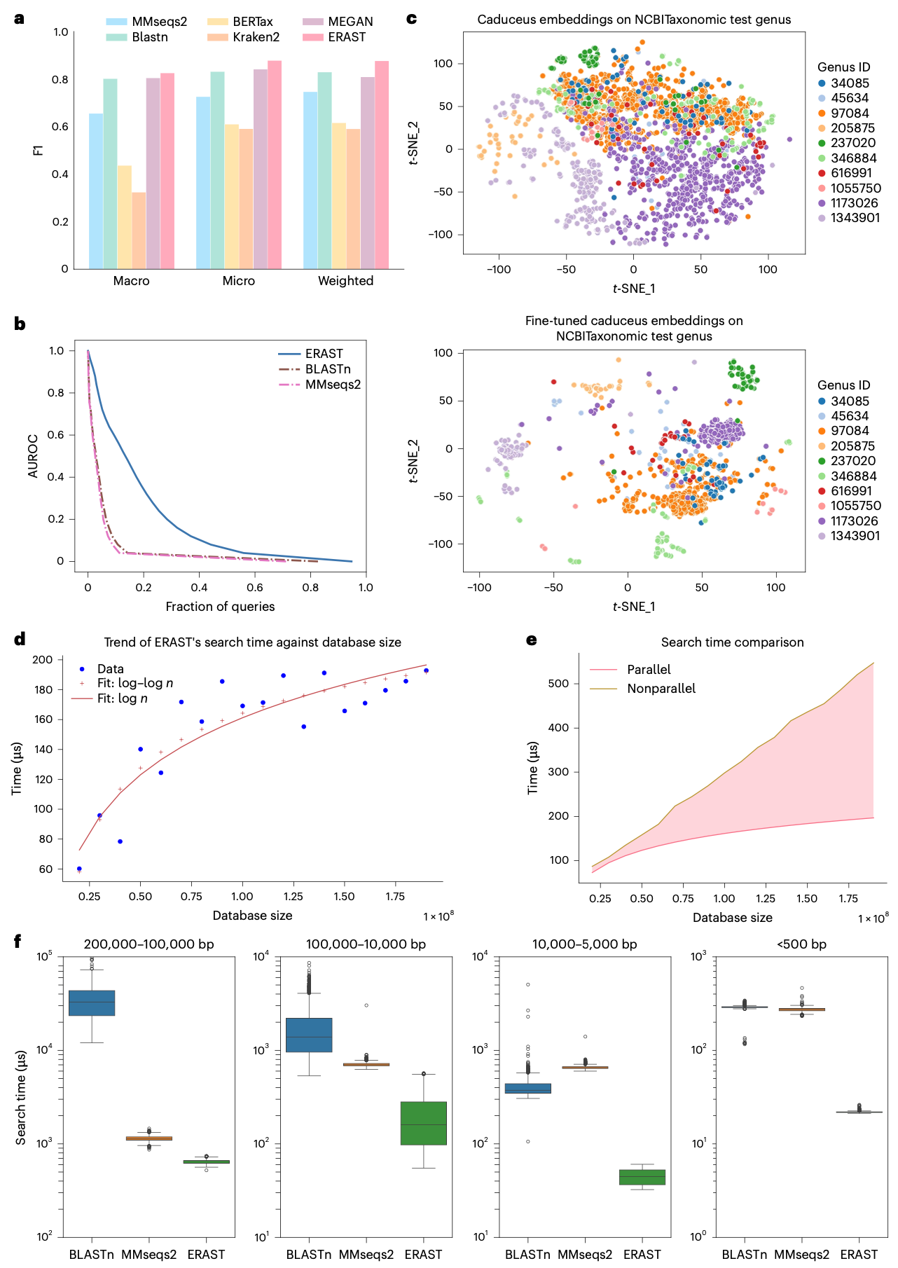 为了进一步展示ERAST在搜索速度上相比其他处理长核苷酸序列的工具的优势,作者从RefSeq数据库中随机采样了2000条不同长度范围的序列进行比较。“全部-对-全部”搜索显示,ERAST在所有长度上都最快:对于>100,000 bp的序列,比BLASTn快60倍,比MMseqs2快2倍;对于<500 bp的序列,分别比BLASTn和MMseqs2快13倍和12倍。最后,作者展示了将生物向量数据库扩展到十亿级样本的能力。测试显示,在不使用并行搜索时,复杂度为O(n),但采用作者的并行策略后,可改进为O(log n) - O(log log n),使得ERAST能够在毫秒内查询(10亿,1280维)的数据库。