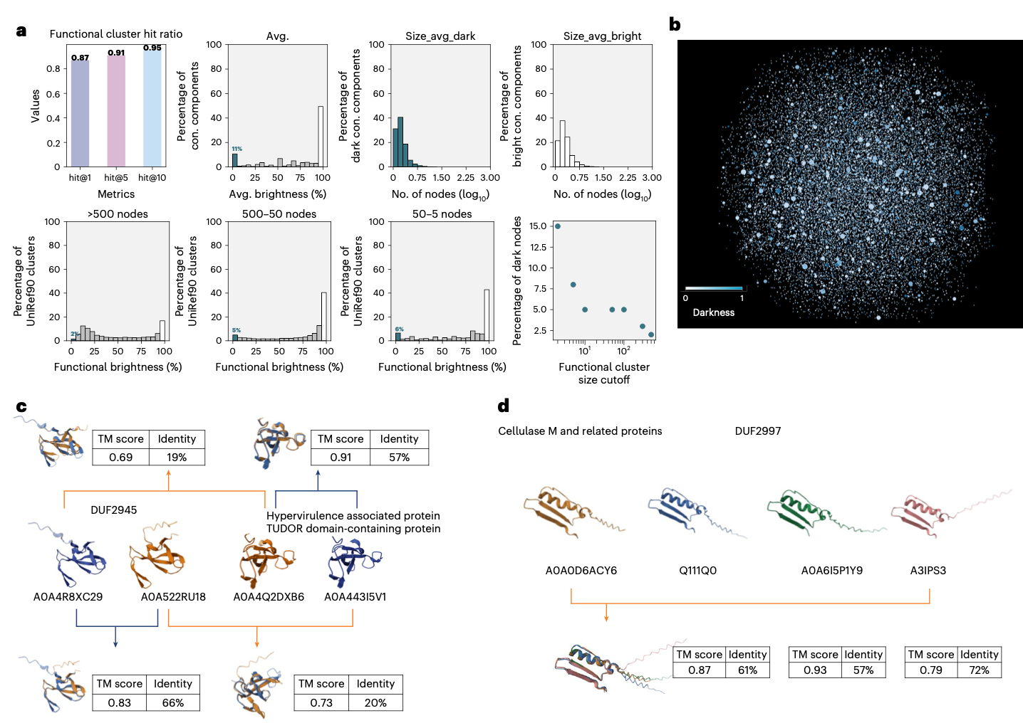 作者通过针对1990万个UniRef90目标测试1000个查询来验证聚类效果。结果显示,大多数查询蛋白质成功识别出共享相同功能簇标签的目标蛋白质,其accuracy@10达到0.95。基于聚类方法的有效性,作者应用转移注释来研究包含不同比例“暗”蛋白质的簇。结果发现了新的潜在关联,例如,功能簇2527(暗度0.665)将未表征的DUF2945蛋白与TUDOR结构域调控蛋白关联起来,结构比对显示尽管序列一致性低于30%,但TM得分>0.6,表明DUF2945可能与TUDOR结构域蛋白具有相似或相关的生物学作用。类似地,功能簇276(暗度0.975)几乎全是“暗”蛋白,其中大多数暗蛋白被注释为DUF2997,而亮蛋白被注释为纤维素酶M及相关蛋白,随机选择的代表之间的结构比对揭示了暗成员和亮成员之间的高度相似性,表明DUF2997可能与纤维素酶M及相关蛋白有关。