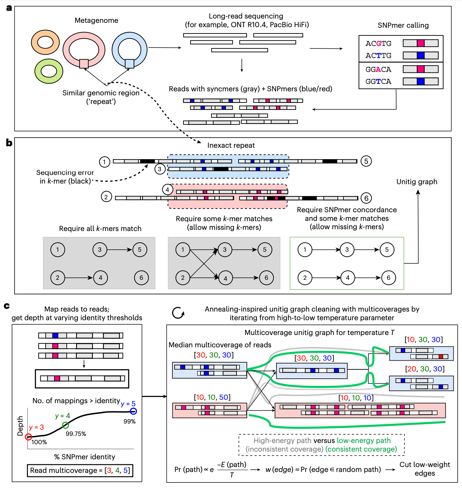 本研究介绍了myloasm,一款专门针对现代高精度长读长(如PacBio HiFi和ONT R10.4)的宏基因组组装工具。myloasm的核心创新在于利用多态性k-mer(SNPmers)在缺乏参考基因组的情况下识别样本内的单核苷酸多态性,并以此构建高分辨率的重叠图(string graph)。此外,myloasm还引入了一种受模拟退火启发的图清理算法,该算法整合了覆盖度深度和重叠信息,以简化组装图。在广泛的基准测试中,myloasm的表现显著优于现有方法。在ONT R10.4数据上,myloasm组装出的完整环状重叠群数量是次优方法的3倍以上,并使ONT数据的组装结果在质量上可与PacBio HiFi相媲美。更重要的是,myloasm能够解析先前方法无法触及的种内多样性,例如从单个肠道宏基因组样本中恢复了6个完整的普雷沃氏菌(Prevotella copri)单重叠群基因组。这些结果表明,myloasm为实现高分辨率、菌株水平的宏基因组组装提供了强大的新工具。