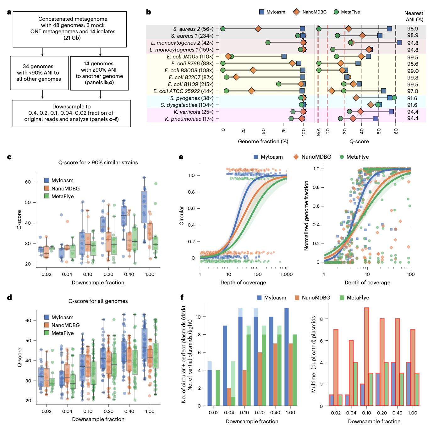 研究人员将一个包含48个基因组的真实ONT R10.4测序数据集(由多个模拟群落和分离株测序数据拼接而成)用于基准测试。myloasm在5组存在密切亲缘关系的基因组(ANI > 90%)上表现最佳,其中位Q-score为49.3,显著高于metaMDBG的35.1和metaFlye的28.6。特别是在包含6个高度相似的大肠杆菌基因组(其中两株ANI达99.53%)的挑战性子集中,myloasm恢复了每个基因组>75%的部分,而其他方法则难以做到。在低覆盖率菌株的组装上,myloasm也表现出更强的鲁棒性。此外,在不同测序深度下采样测试中,myloasm在大多数深度下都获得了最高的中位Q-score和最多的环状单重叠群原核生物基因组。在质粒组装方面,myloasm在所有测序深度下恢复了最多且重复拷贝数最少的环状完整质粒。