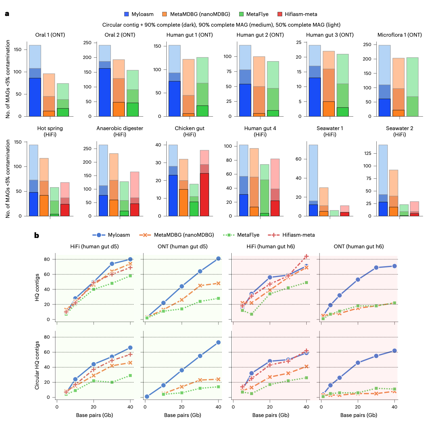 研究人员在6个真实ONT R10.4和6个真实PacBio HiFi宏基因组上评估了各组装器的表现。在ONT数据上,myloasm的优势尤为明显:平均而言,其组装出的完整环状重叠群数量是次优方法的3倍以上。这种优势在不同环境的ONT数据中保持一致,包括口腔、肠道乃至超过100 Gbp的复杂土壤数据集。值得注意的是,在4个ONT数据集中,单个环状重叠群构成了myloasm所获高质量MAGs的80%以上,这表明在足够的测序深度和读长条件下,获得环状完整基因组正成为可能。在HiFi数据上,myloasm在大多数数据集上也恢复了最多的完整环状重叠群和高质量MAGs,尤其是在复杂的海水宏基因组中表现突出。