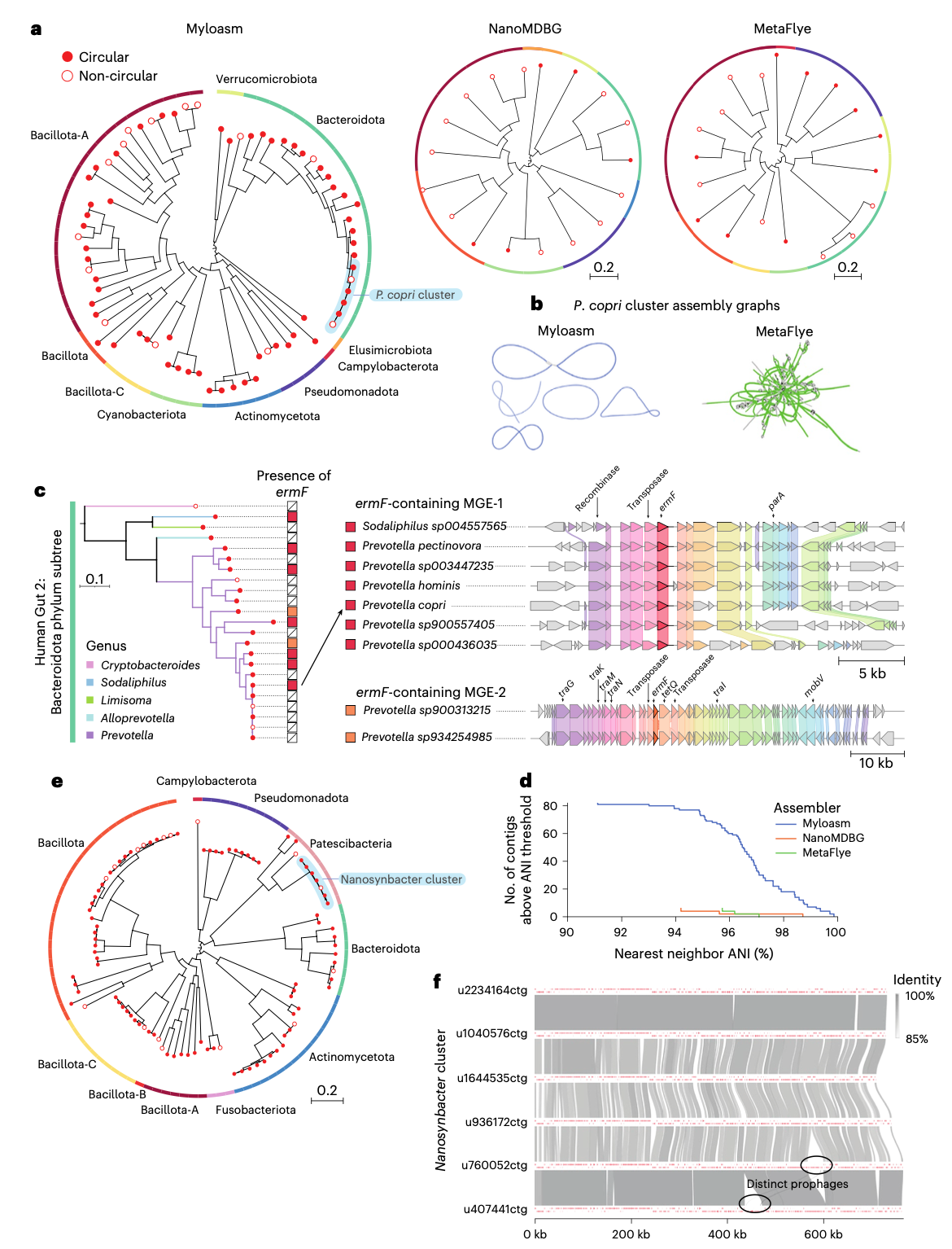 myloasm的高分辨率使其能够解析真实群落中高度相似的共存基因组。在一个人类肠道ONT宏基因组中,myloasm一次性组装出6个普雷沃氏菌(P. copri)的高质量单重叠群基因组(其中4个为环状),而其他组装器无法恢复任何长度大于700 kb的P. copri重叠群。对这些基因组的分析还揭示了与它们可能相关的5个环状染色体外元件。对ermF抗生素抗性基因的分析显示,该基因存在于9个拟杆菌门的高质量基因组中,并且可区分为两个不同的序列,其中一种与一个整合性接合元件相关,表明myloasm能够解析菌株特异性的水平基因转移历史和抗性基因的不同进化轨迹。 在一个口腔ONT宏基因组中,myloasm恢复了82个与组内另一重叠群具有>90% ANI和>70%比对分数的重叠群,而其他方法仅发现6个。其中一个突出例子是一个包含8个Nanosynbacter属(TM7门)基因组的集群,其中6个为环状重叠群。尽管部分基因组对之间的ANI低于95%,但它们显示出完美的基因同线性,并且含有菌株特异性的前噬菌体区域,凸显了myloasm在揭示近缘物种和菌株间多样性方面的能力。