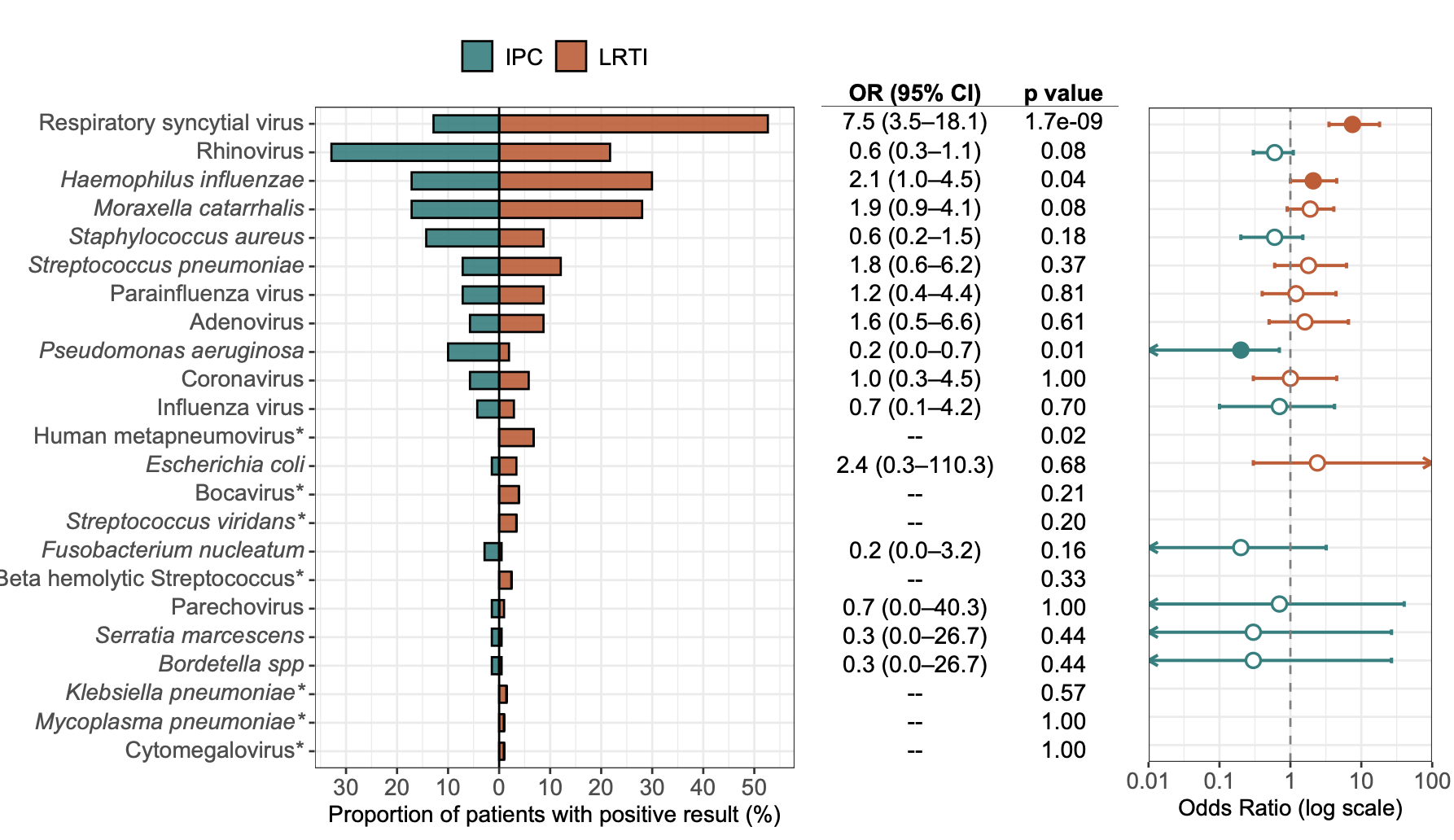 研究通过至少两名医生的盲法临床裁定,将患者分为三组:确诊 LRTI 且有病原体检出(LRTI组,n=207)、非感染性呼吸衰竭但有病原体检出(IPC组,n=70)、非感染性呼吸衰竭且无病原体检出(对照组 CTRL,n=49)。