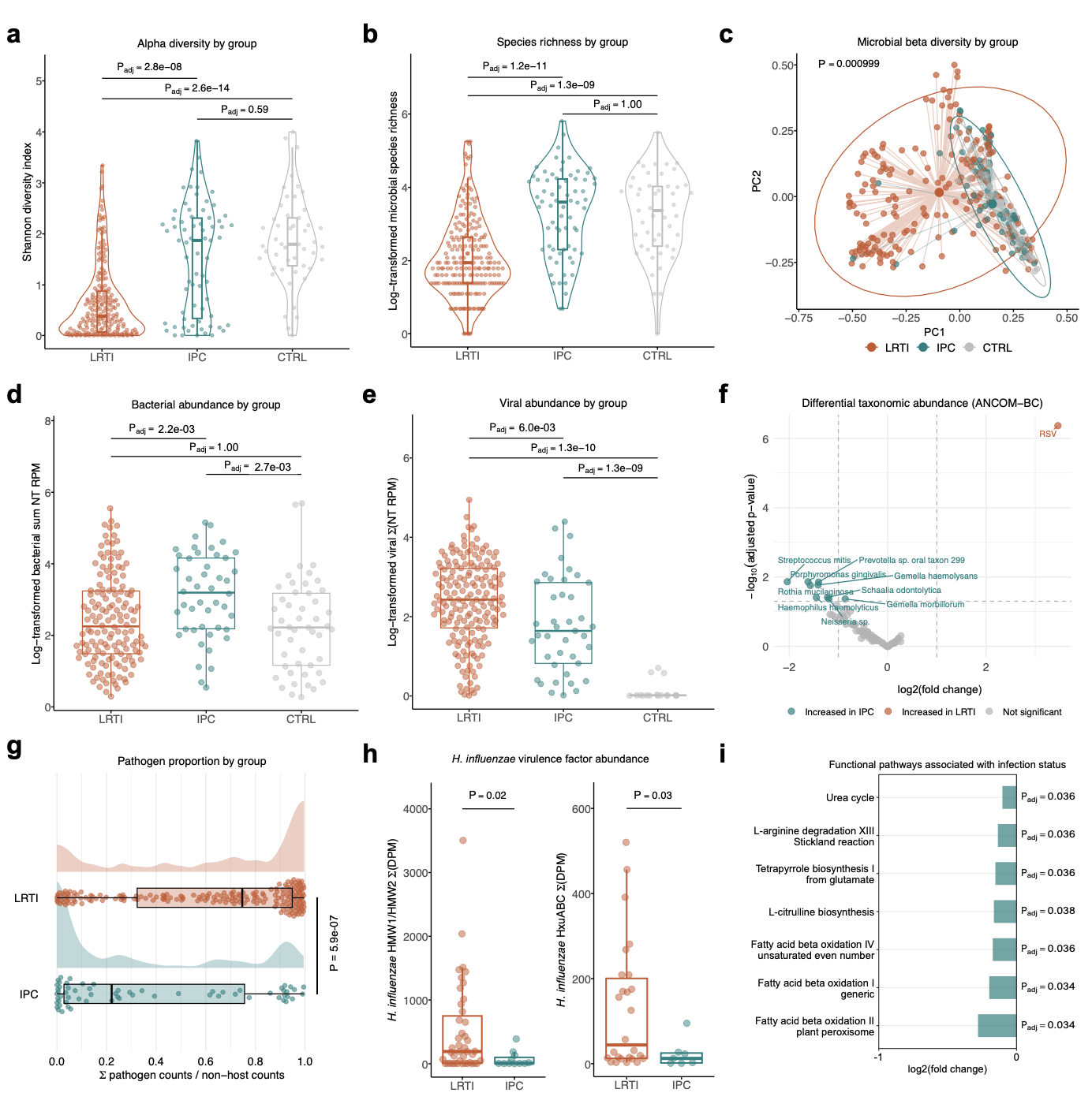 微生物组分析显示,LRTI 患者的气道微生物组 Alpha 多样性(Shannon Index)显著低于 IPC 组和 CTRL 组,且物种丰富度也更低。相反,IPC 组的总细菌丰度(RPM)实际上高于 LRTI 组。在分类学上,IPC 组富集了普雷沃氏菌属(Prevotella)、奈瑟菌属(Neisseria)等经典共生菌和厌氧菌;而 LRTI 组仅呼吸道合胞病毒(RSV)显著富集。功能分析发现,IPC 状态下微生物的代谢通路(如脂肪酸β-氧化、精氨酸降解)更为活跃,且流感嗜血杆菌的毒力因子(如粘附素 HMW1/2)在 LRTI 中表达更高。