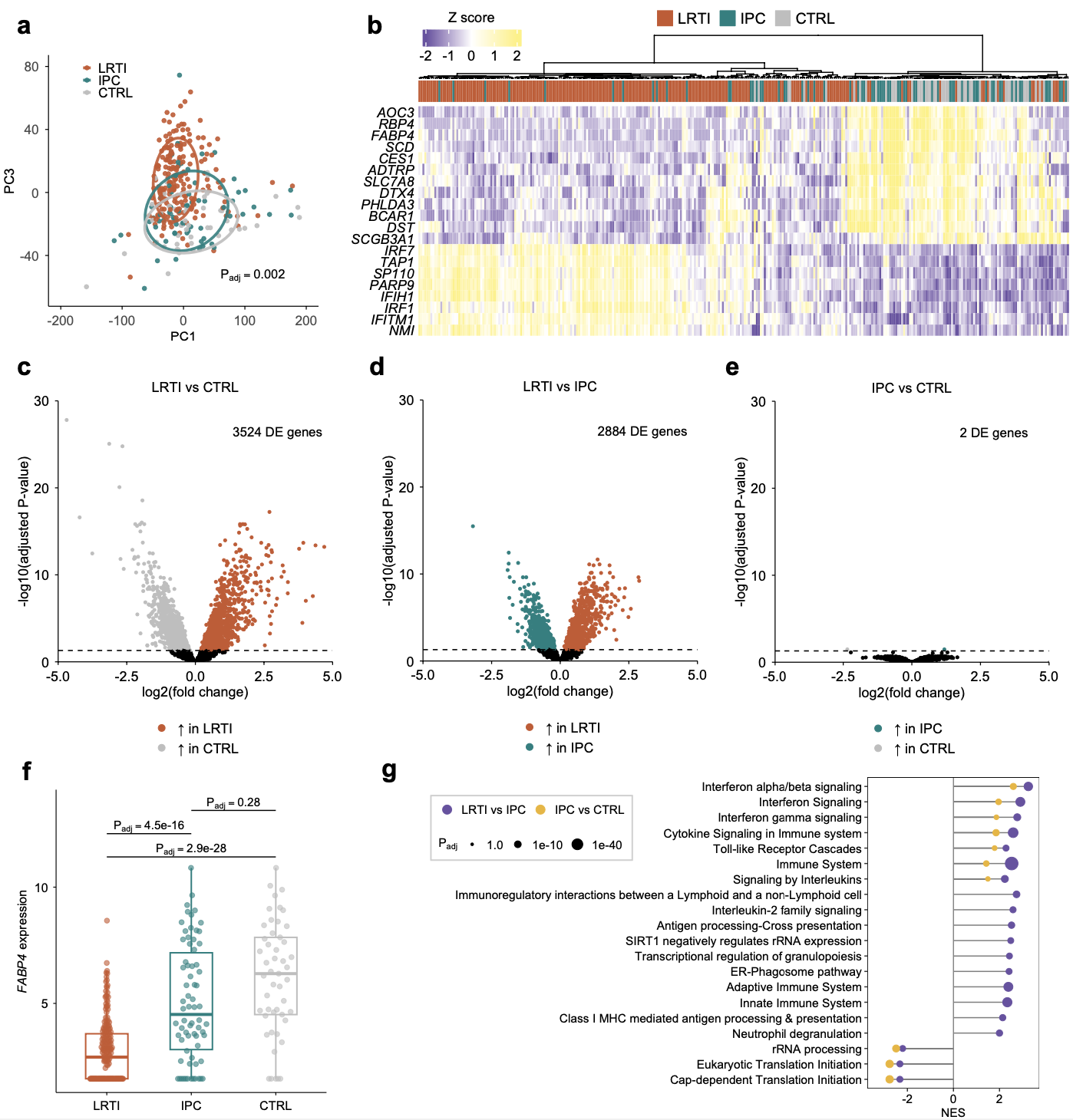 宿主转录组分析表明,LRTI 患者具有独特的免疫激活特征,涉及干扰素信号、抗原呈递和中性粒细胞脱颗粒等通路的上调,与 IPC 或 CTRL 组存在显著差异(3517 个差异基因)。相比之下,IPC 组的转录谱与未感染对照组极为相似(仅 2 个差异基因)。值得注意的是,FABP4(脂肪酸结合蛋白 4,一种巨噬细胞相关的脂质伴侣)在 LRTI 中表达显著上调,是区分感染状态的关键 outlier 基因。