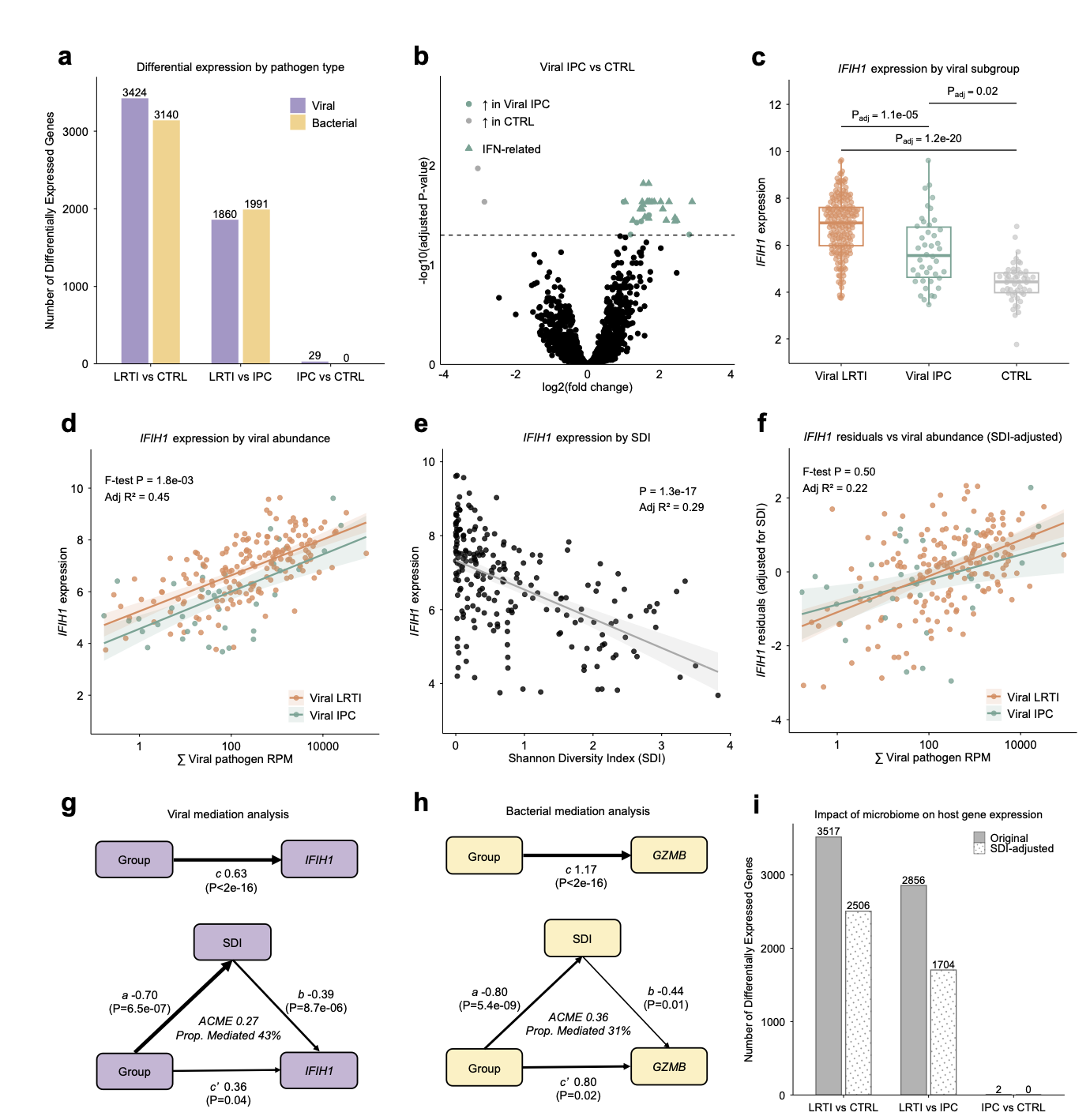 细分分析发现,病毒 IPC 会诱导微弱的干扰素刺激基因(ISG)表达,而细菌 IPC 则完全未引起明显的转录组变化。回归分析显示,虽然 ISG 表达与病毒载量正相关,但在相同病毒载量下,IPC 患者的 ISG 反应强度显著低于 LRTI 患者(即存在“应答衰减”现象)。此外,中介分析表明,较低的微生物 Alpha 多样性与较高的 ISG 表达独立相关,暗示微生物组结构可能调节宿主对病毒的免疫反应。