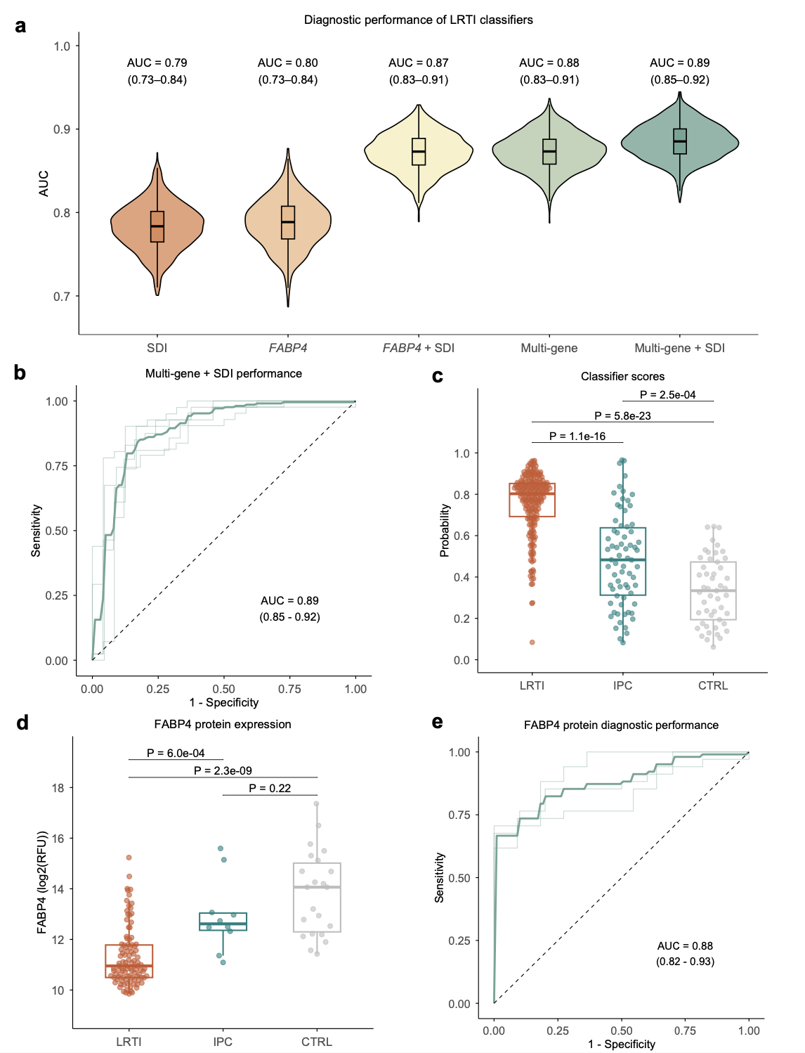 基于上述发现,研究人员构建了诊断分类器。结果显示,单独的 FABP4 基因结合 Alpha 多样性指标即可达到 AUC 0.87;若整合多基因宿主转录谱与 Alpha 多样性,AUC 可达 0.89(95% CI 0.85-0.92)。在拥有蛋白数据的子集中,单独检测气道 FABP4 蛋白水平即实现了 AUC 0.88(95% CI 0.82-0.93)的优异性能,显示出其作为临床生物标志物的巨大潜力。