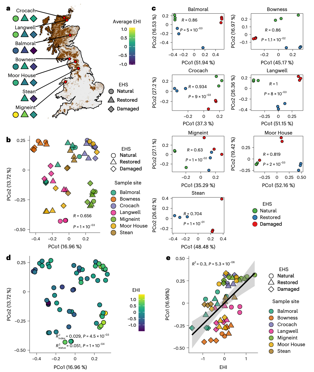 虽然EHS在地点内对样品进行了分组,但分离程度各异,表明当地环境条件重要。这与这些地点跨越气候梯度且退化和恢复水平不同的事实一致。然而,与自然对比相比,受损泥炭地的土壤更少积水、更富氧且更酸性,而恢复泥炭地的土壤显示出缓解迹象。总体而言,这些结果表明,虽然地点水平差异显著,但EHS捕捉了跨泥炭地地点的有意义的环境变异。同样,EHI的变化提供了在给定泥炭地内比较不同EHS区域时跟踪生态系统健康相对改进的有用手段。
