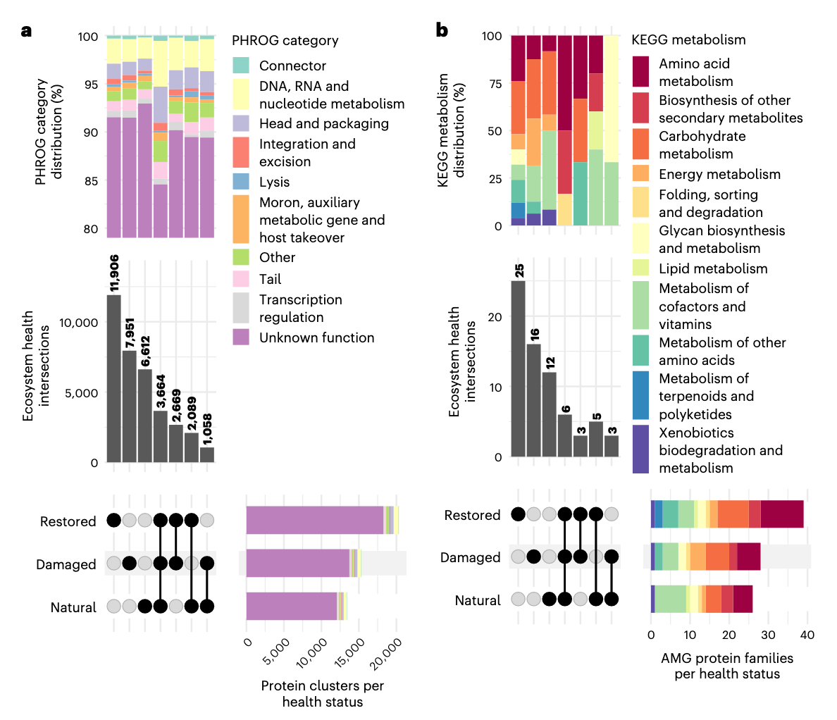 研究人员还关注了病毒辅助代谢基因及其在EHS间的分布。AMGs是宿主衍生的具有代谢功能的蛋白,为病毒提供进化和适应度益处。与全蛋白结果类似,最大交集对应于单个EHS独特的KEGG蛋白家族,强化了这些病毒基因组编码的代谢功能在不同环境条件间独特的观点。同样,高级KEGG代谢类别在主要交集间的分布 largely 相似,类别如“碳水化合物代谢”、“辅因子和维生素代谢”和“氨基酸代谢”有良好代表。然而,与仅自然和仅恢复样品相比,仅受损样品中能量代谢基因比例有小增加,预测功能涉及硫代谢、甲烷代谢和氧化磷酸化。这种微妙转变可能指示功能适应,受损、富氧土壤中的病毒可能在其宿主中更积极参与与电子传递相关的过程,为其自身利益。总之,病毒蛋白和AMGs在EHS间高级功能不独特,但它们局部适应特定恢复背景。