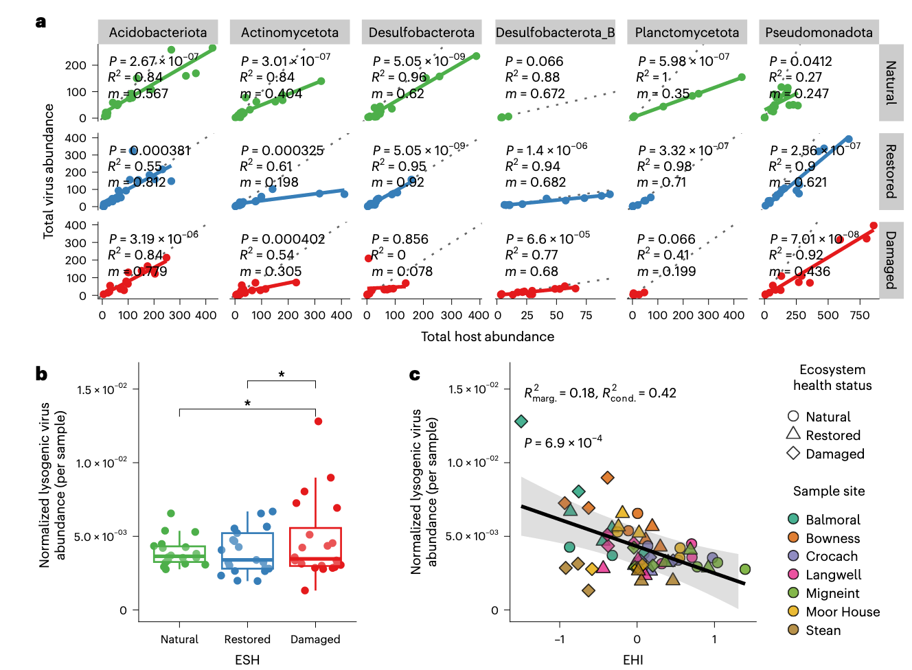 虽然“搭便车赢家”动态在英国泥炭地土壤中盛行,但跨EHS的温和(以下简称溶原性)和主动复制病毒丰度模式突出了病毒-宿主相互作用的显著转变。研究人员总共识别了297个溶原性病毒,占所有识别病毒的13%,并分析了它们在每个样品中的丰度。溶原性病毒丰度模式在不同地点间变化,聚合所有地点时其原始平均丰度无显著差异。然而,当按每个样品中总病毒种群标准化溶原性病毒丰度时,发现溶原性病毒的比例在自然和恢复土壤中显著低于受损土壤。这表明溶原性病毒在受损土壤中对整体病毒群落的贡献更 substantial。此外,当建模标准化溶原性病毒丰度作为EHI的函数同时考虑地点水平变异时,观察到显著负相关。这表明溶原性病毒的相对丰度随泥炭地退化增加。总之,这些发现表明,随着泥炭地从自然状态转变为受损状态,溶原性病毒的复制增加。