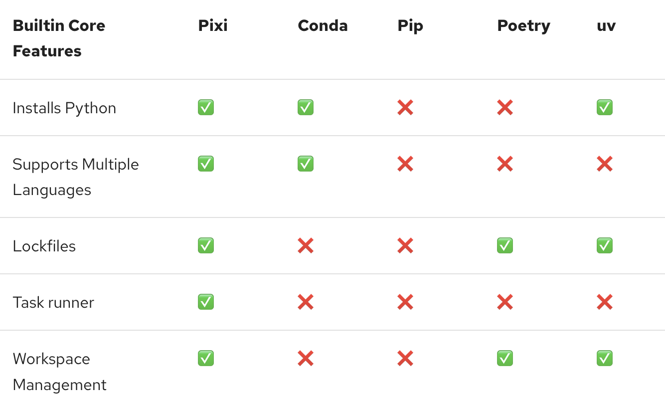 Pixi 通过一个统一的配置文件 pixi.toml 和一个命令行工具 pixi,将依赖管理、环境隔离、任务执行全部整合在一起,支持 Linux、macOS 和 Windows。