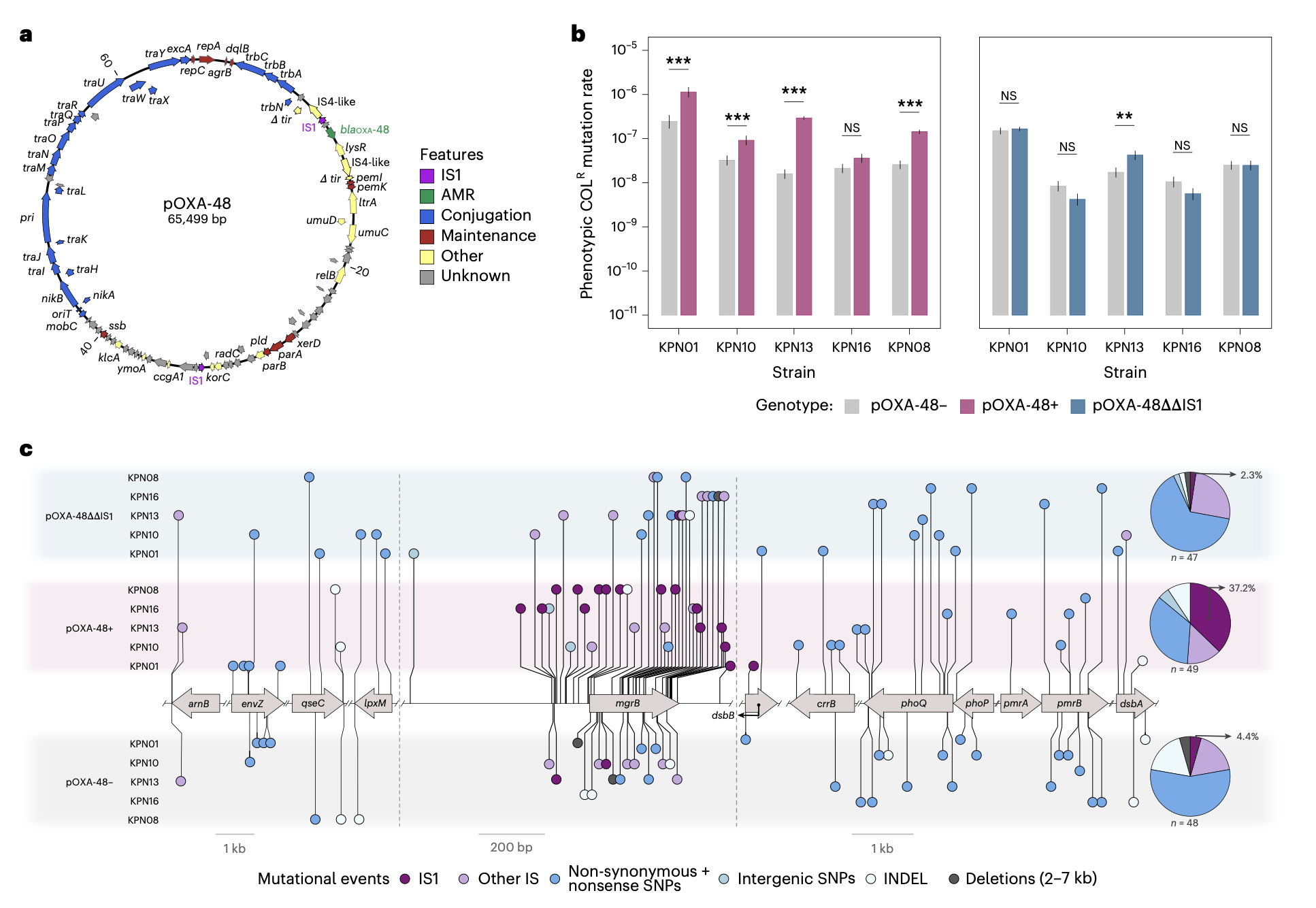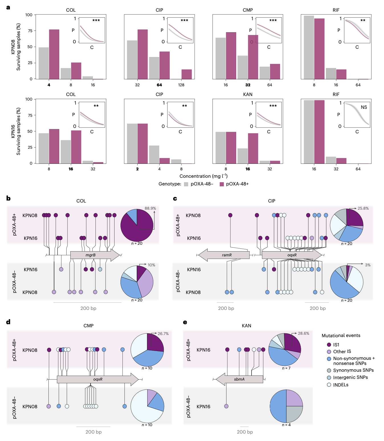 高通量耐受性实验表明,在大多数测试的菌株-抗生素组合中,携带pOXA-48的菌群在更高抗生素浓度下的存活数量显著多于其无质粒对应株(利福平除外)。对存活种群的测序证实,对于多粘菌素、环丙沙星、氯霉素和卡那霉素,pOXA-48的存在均与更高比例的IS1介导的基因失活事件相关。这些失活靶点涉及脂质A合成通路、RND外排泵负调控基因以及膜转运蛋白基因等。