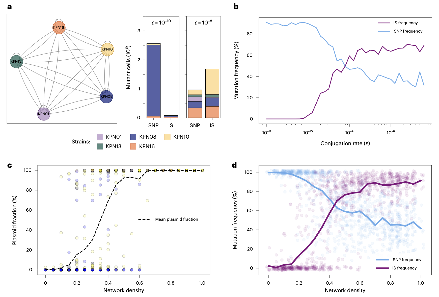 计算机模拟再现了质粒入侵多克隆细菌群落的过程。模型显示,当接合频率超过一个临界阈值时,质粒能够在种群中迅速扩散并达到稳定存在。在质粒广泛扩散后,IS转座取代SNP成为主要的突变类型,导致群体整体突变负荷增加。对随机生成的接合网络进行模拟表明,随着网络密度(即菌株间接合连接的可能性)增加,质粒的流行度和每个细胞的平均IS突变数均上升,在高密度网络中,IS转座成为主导的突变类型。该模型证实,在现实的质粒转移速率和群落结构参数下,接合质粒能够通过IS介导的基因失活普遍地促进AMR进化。