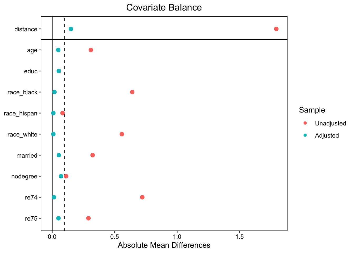love.plot(m.out, stat = "mean.diffs", abs = TRUE, threshold = 0.1)