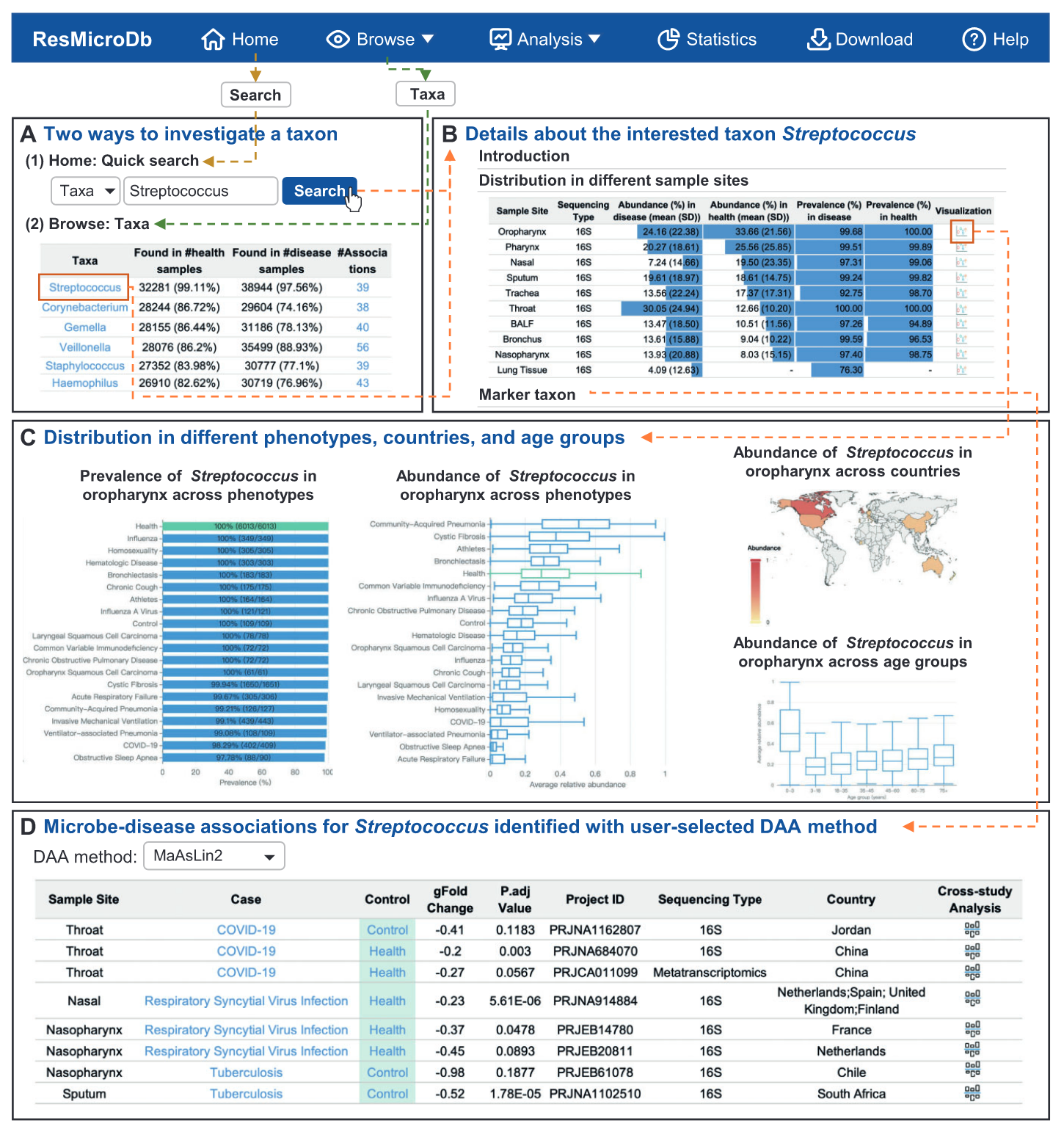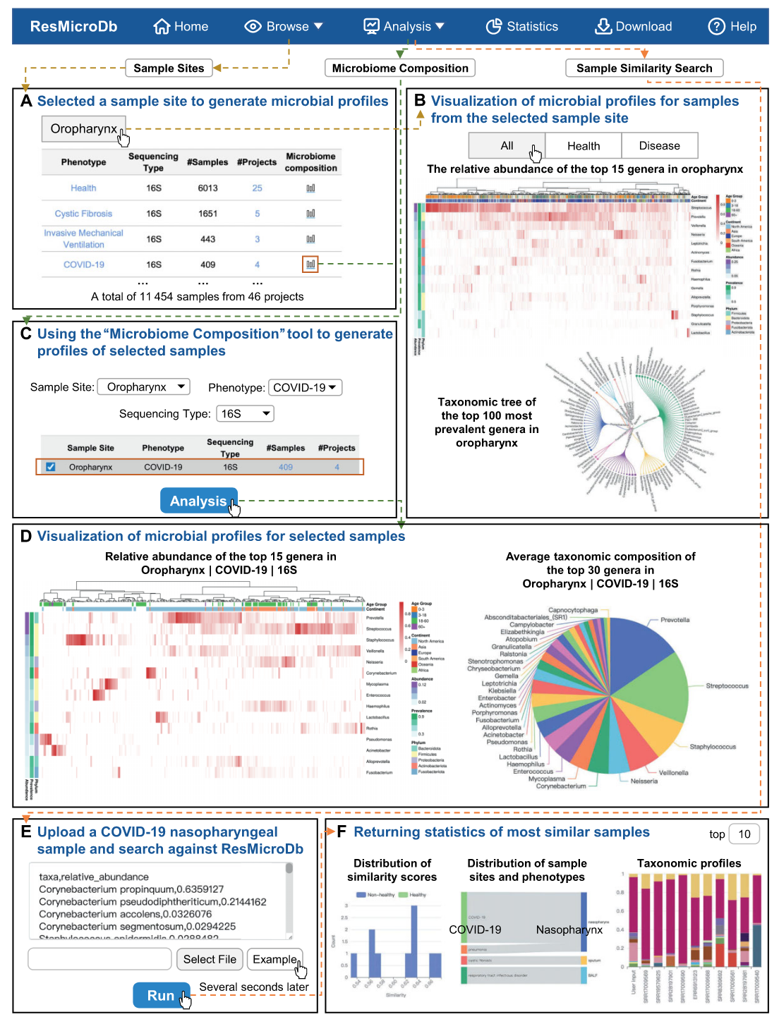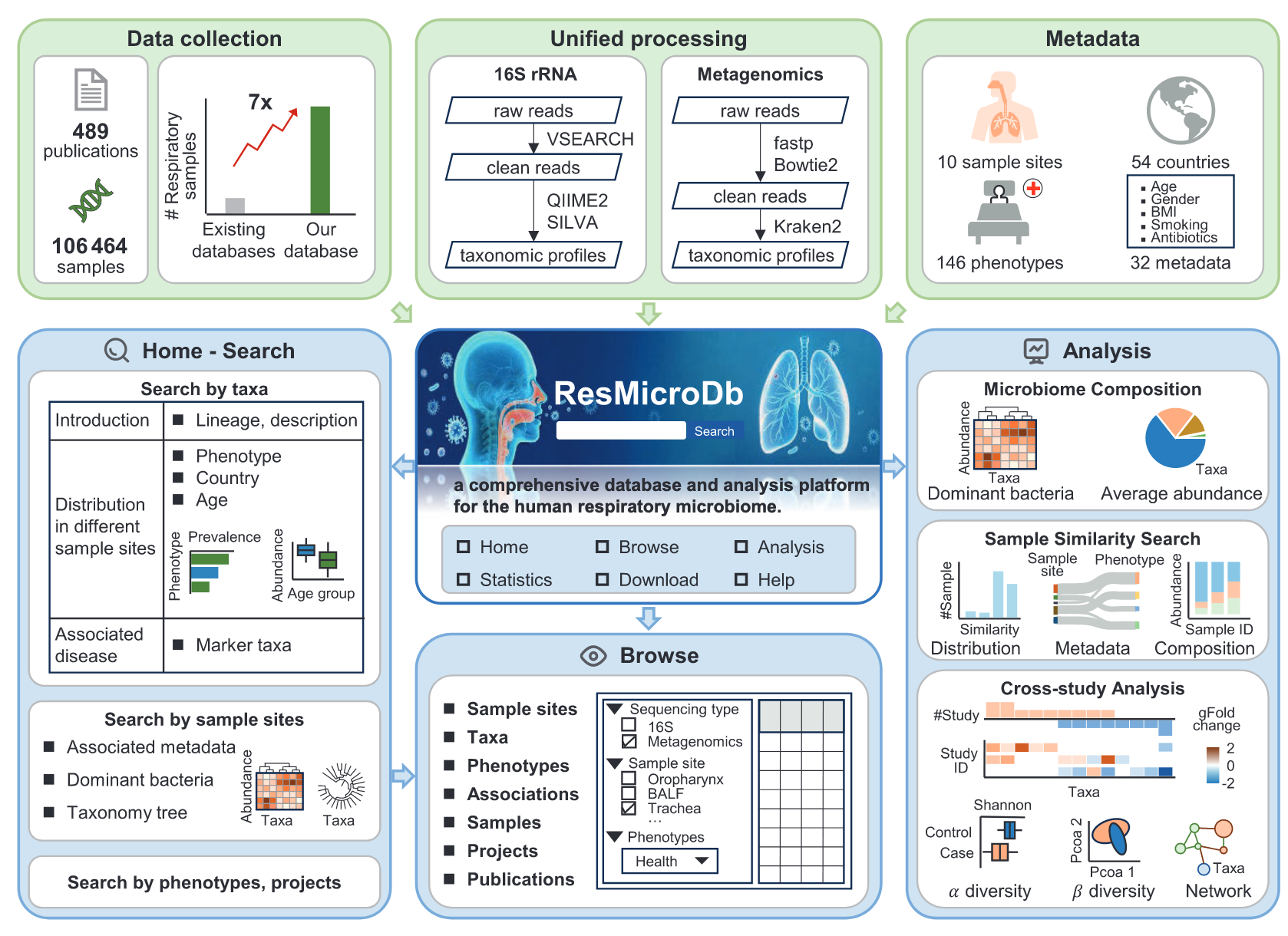 ResMicroDb(https://resmicrodb.cncb.ac.cn/)是一个致力于人类呼吸道微生物组研究的综合数据库和分析平台。该数据库整合了来自514个项目的106,464个样本,跨越10个呼吸道部位和146种表型,以及31个经过整理的元数据字段。数据库还包括从132个病例对照研究中识别出的11,908个微生物-疾病关联。ResMicroDb具有用户友好的Web界面,用于查询、浏览、可视化和分析呼吸道微生物组数据,提供三个集成的分析工具:微生物组组成可视化、样本相似性搜索和跨研究分析。