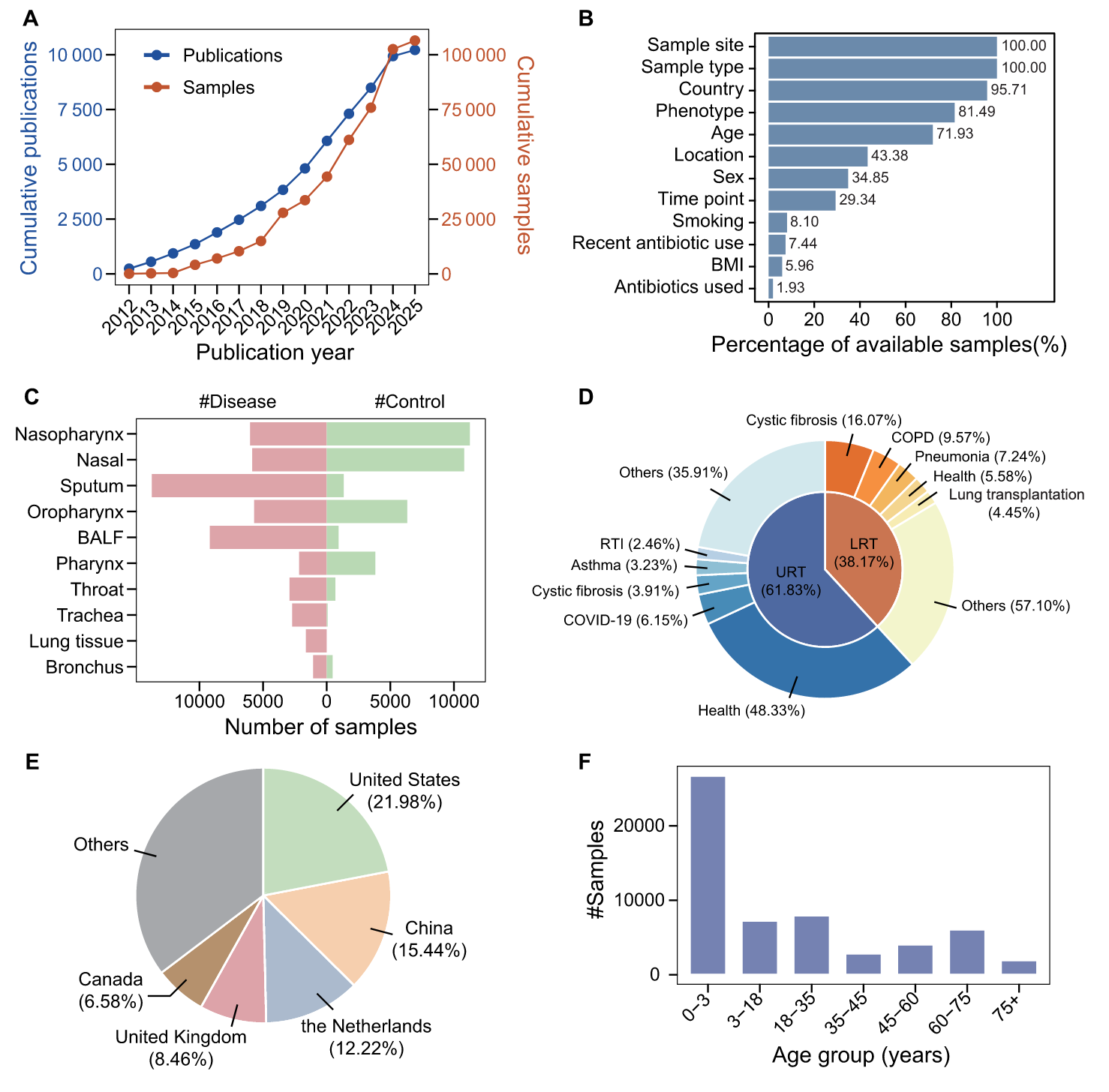 截至2025年1月31日,PubMed已收录超过1万篇呼吸道微生物组相关论文,公共数据量逾10万样本。现有多部位微生物组数据库(如mBodyMap、HumanMetagenomeDB和BugSigDB)虽包含部分呼吸道数据,但样本量有限、解剖部位注释粗糙,且宿主信息不完整。这些局限性凸显了构建高质量呼吸道微生物组专用数据库的迫切性。
