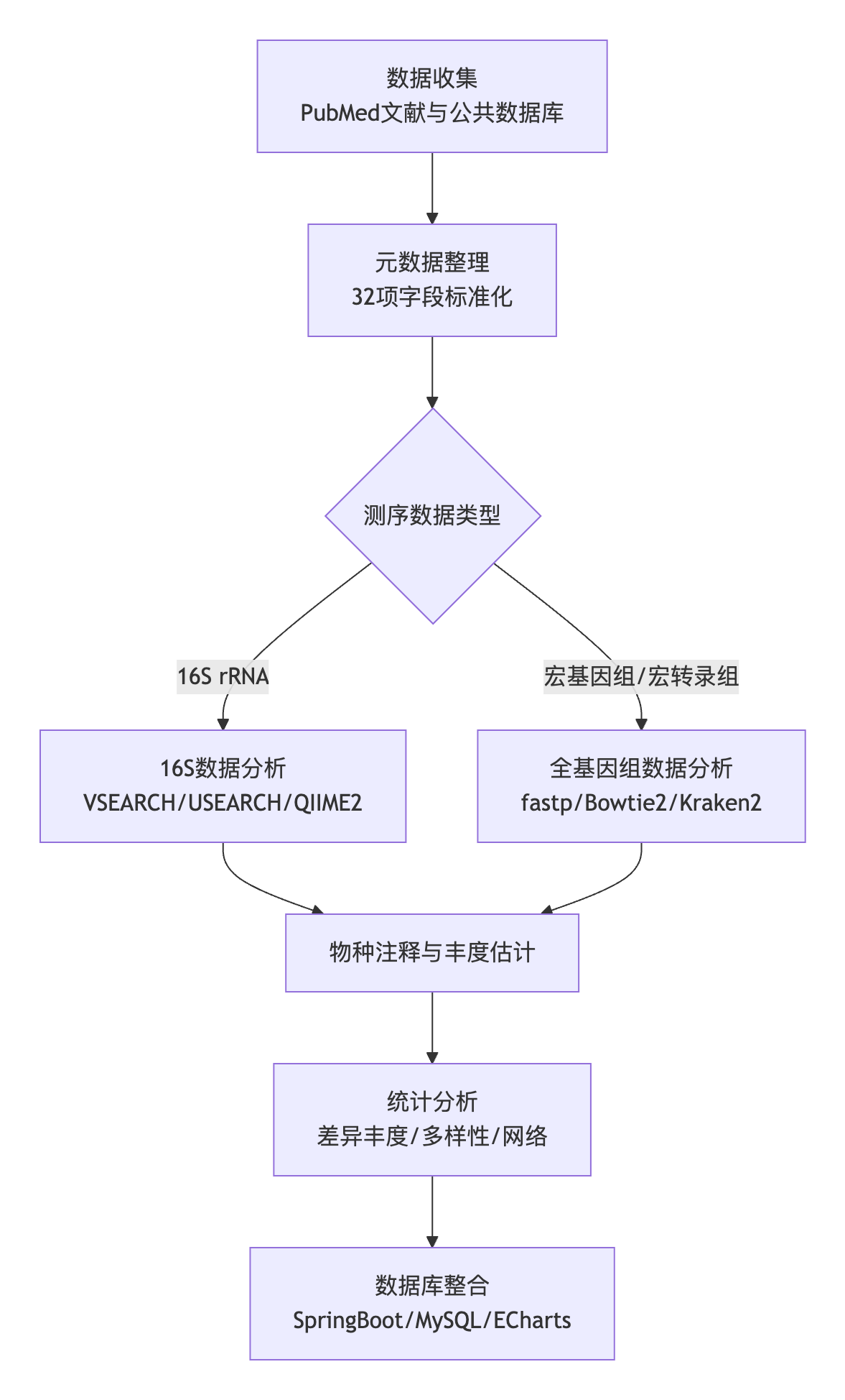 - 16S数据:使用VSEARCH进行序列合并、去噪和嵌合体去除,生成ASV;通过QIIME2和SILVA数据库(v138)进行物种分类。