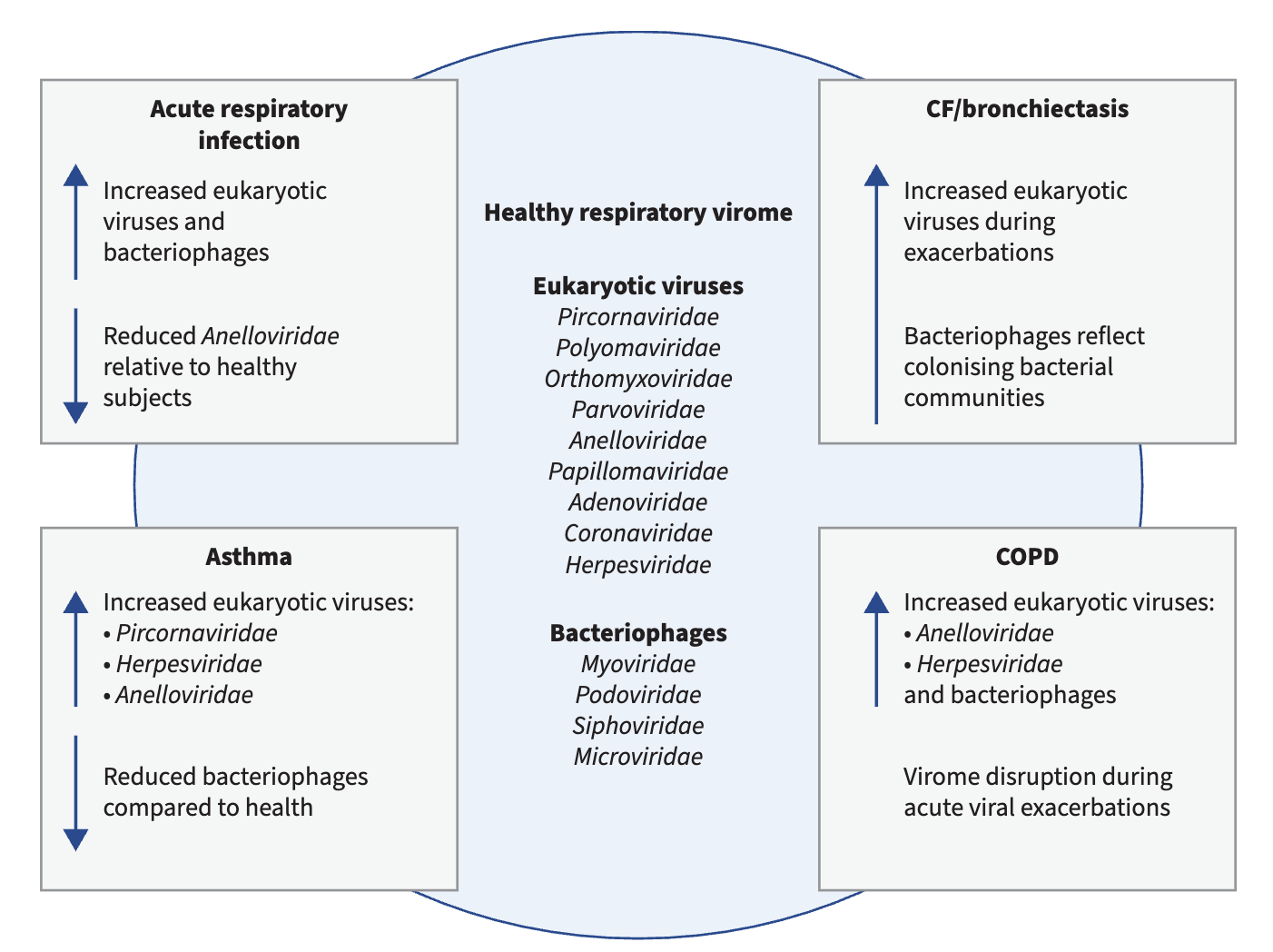 SARS-CoV-2大流行促进了全球对病毒监测和测序基础设施的投资,强调了理解不仅单个病毒,还有病毒相互作用、共感染及其对免疫反应和疾病严重性影响的重要性。然而,大部分呼吸道病毒组,尤其是在患有慢性肺病的成人中,仍然未知,病毒组研究在数量和质量上仍然落后于细菌组研究。