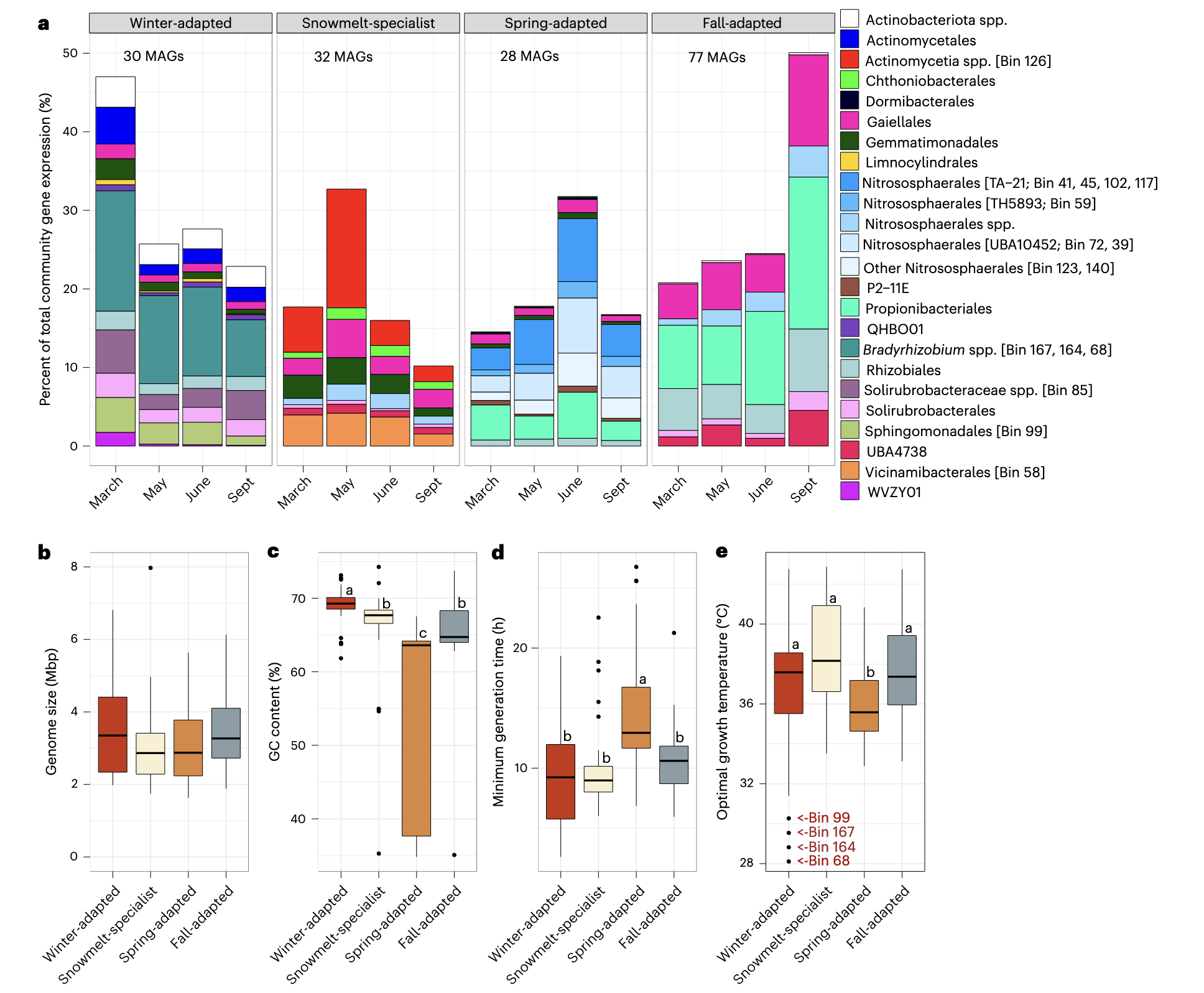 融雪专家型MAGs在融雪期具有最高的基因表达,并且两个融雪专家型MAGs相对于其丰度表现出不成比例的高活性。例如,放线菌纲物种在5月占总相对群落基因表达的8-24%,但基于基因组覆盖度的相对丰度仅为1-2%。春季适应型响应组主要由属于四个属的9个古菌MAGs主导(全部属于硝化球形菌目)。这些古菌MAGs在6月占总群落基因表达的23%。春季适应型生物具有最低的GC含量、最长的预测世代时间和最低的预测最适生长温度。