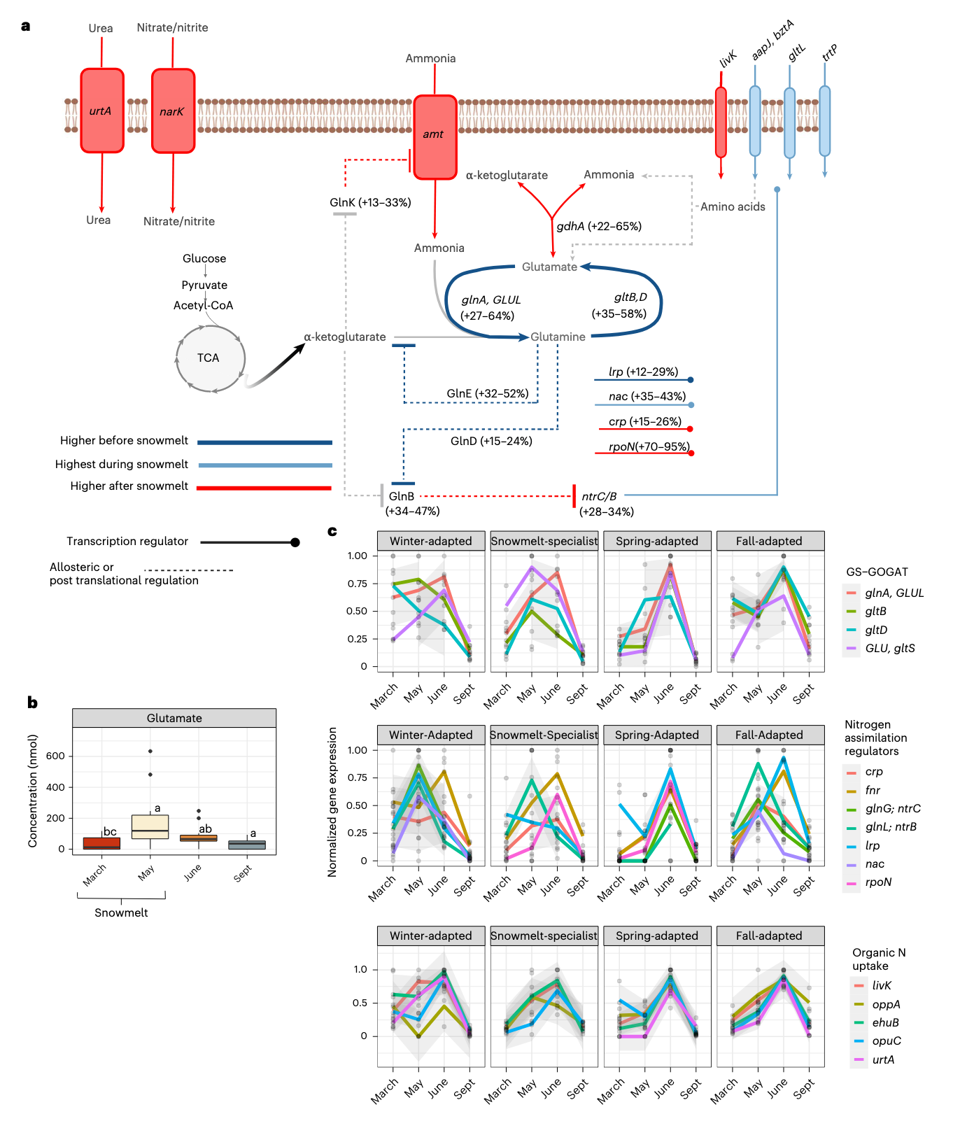 接下来,研究人员研究了溶解有机氮的变化如何影响微生物氮同化策略。通过谷氨酰胺合成酶-谷氨酸合酶途径从氨同化氮的基因表达受到融雪的强烈影响,控制有机氮吸收的转录调节因子和转运蛋白也是如此。大多数核苷酸中的氮来源于谷氨酰胺中的酰胺键,而所有氨基酸生物合成的主要氨基来源于谷氨酸。因此,谷氨酰胺和谷氨酸的产生对生物量生产至关重要,研究人员预计谷氨酰胺合成酶-谷氨酸合酶途径在微生物爆发期间表达最高。谷氨酸是所有含氮小分子代谢物中浓度最高的,并且在3月和5月之间显著增加。正如预测的那样,谷氨酸生产的时间趋势与融雪期间发生的微生物生物量生产的时间趋势相关。