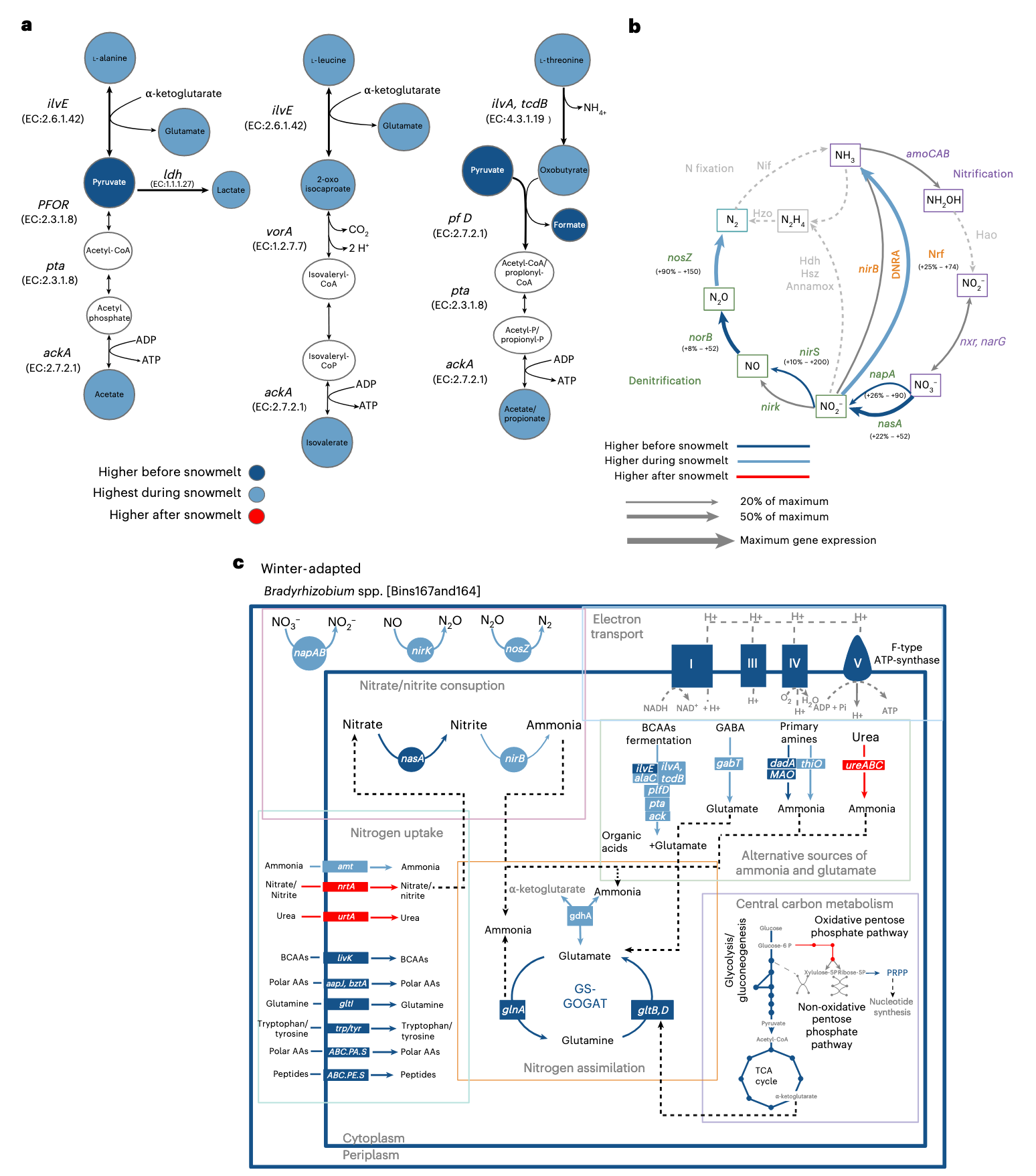 冬季适应的慢生根瘤菌在5月对氨基酸转氨的高基因表达(苏氨酸脱水酶、支链氨基转移酶、谷氨酸-丙酮酸转氨酶等),以及丙酮酸甲酸裂解酶、磷酸乙酰转移酶和乙酸激酶的高基因表达,表明氨基酸的厌氧降解是生物合成氮的重要来源,并在融雪期间产生有机酸。其他可发酵底物,如碳水化合物,也可能在融雪期间是有机酸的来源。冬季适应的慢生根瘤菌MAGs在5月微生物爆发期间对硝酸盐还原、一氧化氮还原和一氧化二氮还原具有高基因表达。总的来说,这些基因表达模式意味着冬季适应的慢生根瘤菌物种利用氨基酸厌氧降解产生的氮进行有机氮同化,并在融雪期间通过反硝化产生能量。这一结果突出了该生物体在微生物爆发期间协调有机和无机氮转化以获取能量和生长的能力。