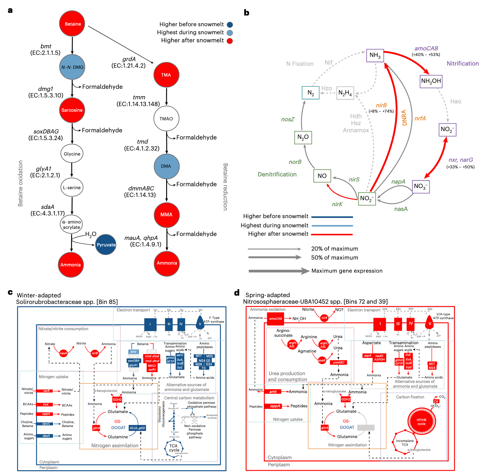 甜菜碱和其他甲基化胺在6月生物量崩溃前后具有高浓度。观察到的甲基化胺包括甜菜碱分解代谢两条途径的特征性降解产物:由甜菜碱-高半胱氨酸甲基转移酶启动的氧化途径,或经由三甲胺并起源于甜菜碱类似Stickland还原的降解途径。与甜菜碱氧化降解相关的基因在3月融雪开始前表达更活跃,而与还原性甜菜碱降解相关的基因在6月融雪后表达更活跃。